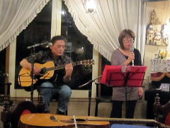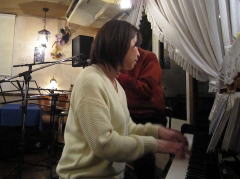 | そして、ピアノのバッキングで唄ってみたい・・・とおっしゃるSさん(中画左)のリクエストで、BEATLESさんの‘Yesterday’、そして、フランクシナトラさんの‘My Way’を。Jazz風のアレンジでとってもかっこいいバッキングでした。まさにリサイタル気分に酔いしれて・・・のSさんは、思わず?「今夜は僕のために来てくださって、どうもありがとう」・・・会場からは、お約束の「帰れ〜」となりました。Kさん、またステキなピアノを聴かせてください。 | ||