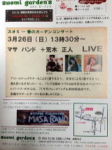 ![]() 日一日と、春の足音が大きくなる3月末。『Suomi Garden's 春のコンサート』にお招きいただき、演奏させていただきました。 たくさんの木々に囲まれたSuomi Garden's。その芽吹きを感じつつの野外LIVE。天気予報では、LIVEがスタートする午後から下り坂・・・とのことでしたので、案じておりましたが、みなさんの日頃の行いよく、時折陽も差す爽やかな天候のもと、演奏させていただけました。いささか寒い中、お聴きくださったみなさま、本当にありがとうございました。 今回は、わたくし‘や’が諸事情で参加できなかったため、バンマスさんのご友人でLIVEお仲間のAさんにお手伝いいただきました。 LIVE後には、Suomiさんの石窯焼きのPizzaやサンドイッチをごちそうになりました。 |