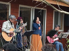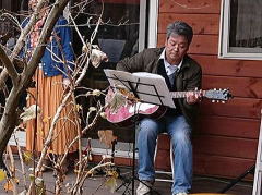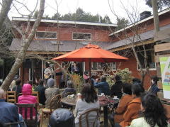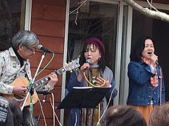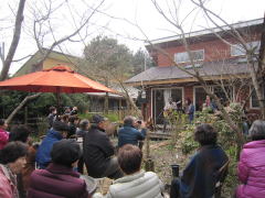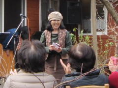 | LIVE会場は、Suomi さんの中庭。ステージは店舗のテラス。奥様には丁重なご紹介をたまわり(中画)、たいへん恐縮でした。寒い中、本当にたくさんの方々にお集まりいただき、手拍子やたくさんの拍手をいただきました。重ね重ねありがとうございました。 | ||