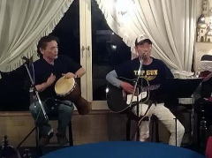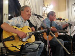 ここで、相方のアイボ(Y川)さんが加わり、ユニット「アイボリー・ムーン」さん完成・・・ということで、十八番の曲を。まずはきくち寛さんの‘ホンキー・トンク・ピアノ’を。つづいては、デュランUさんの‘今宵君と’を。そして、アイボさんのファンキーなギターバッキングで、会場の皆さんといっしょに「早口言葉」。 大いに盛り上がったところで、しっとりとラストナンバー。りりィ+洋士さんの‘残そう’で〆。 |