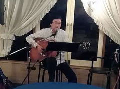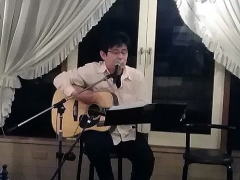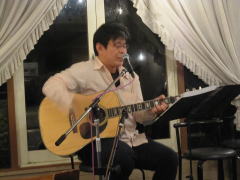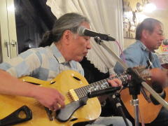 まずは、ギタリストY口(左画)さん。ギターインストで‘ハナミズキ’〜‘少年時代’。そして、坂本さんの‘見上げてごらん夜の星を’。やさしいギターアルペジオが楽曲に大変マッチして、聴いていると、とても癒されました。 |