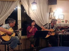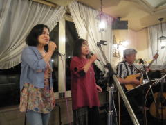 ここで、フルートプレーヤーのK藤さん(中画・右画)を招いて、1曲。今宵はS木さんご令嬢のオリジナルだそうで^^v。青い空に白い雲・・・、コーラスも美しくとっても爽やかな曲でした。ギターバッキングも「メジャーセブンス」を要所に配して、爽快感のあるバッキングでした。さすが、ベル・ウッドS木さん、の娘さんいうとこです。 |