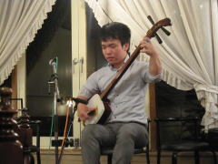 気分を落ち着けるように、三味線のチューニング、調弦というのでしょうか?・・のお話を。三味線には「本調子」「二上がり」「三下がり」の3種類が主だそうです。中でも「本調子」と「二上がり」を使うことが多く、今宵もそのふたつの調弦での演奏でした。MCしながら、調を変えて、2曲目は‘新じょうんから節’を。指の動きもなめらかに、つづいて‘津軽たんと節’。そしてラストナンバーは‘即興曲’を。持ち合わせているフレーズを紡いで、その場その場で曲を作り上げていく・・・いわゆるアドリブ演奏・・・圧巻でした。 横月さん曰く「寝ぼけたおじさんたちの目を覚ます演奏でした」のとおり、キレキレの演奏、バチさばきでした^^。 |